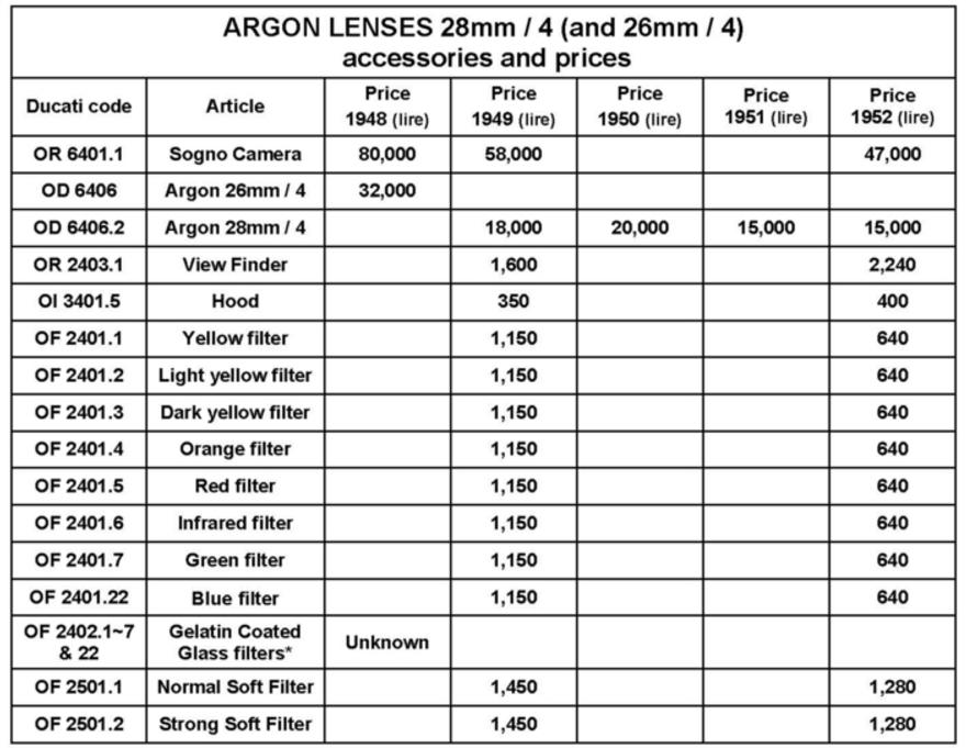 In the first price list of 1948, the 26mm (non-commercially produced Argon version) was quoted at a cost of 32,000 lire and was not accompanied by any accessories.