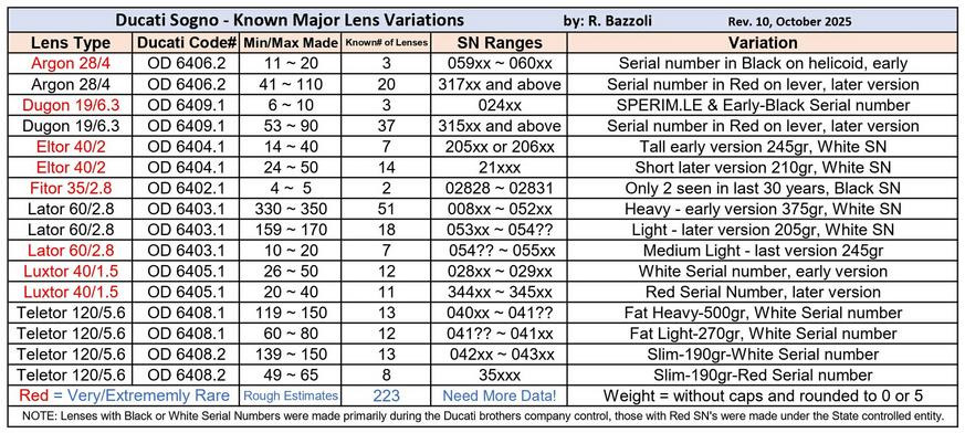 The table below is our current understanding of the known probable lens variations. It is an ongoing project of ours to help the collecting community to better understand the rarity (and value) of their precious lenses.