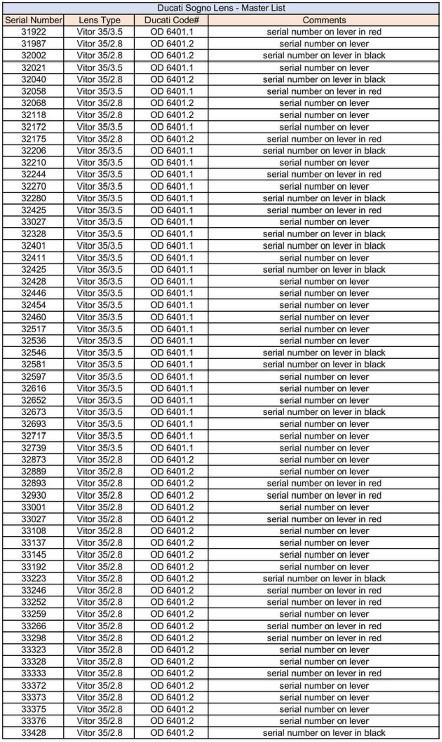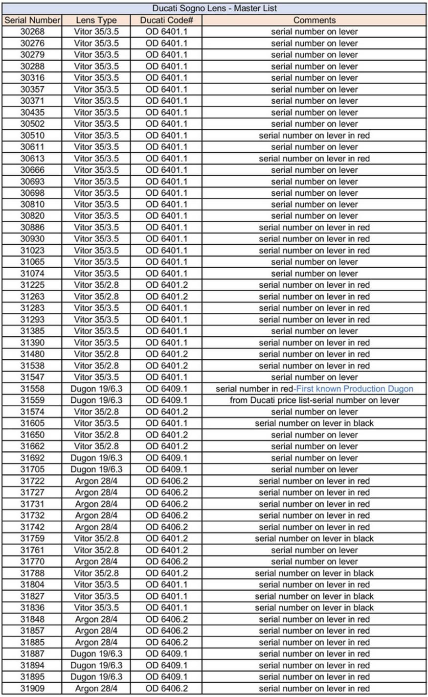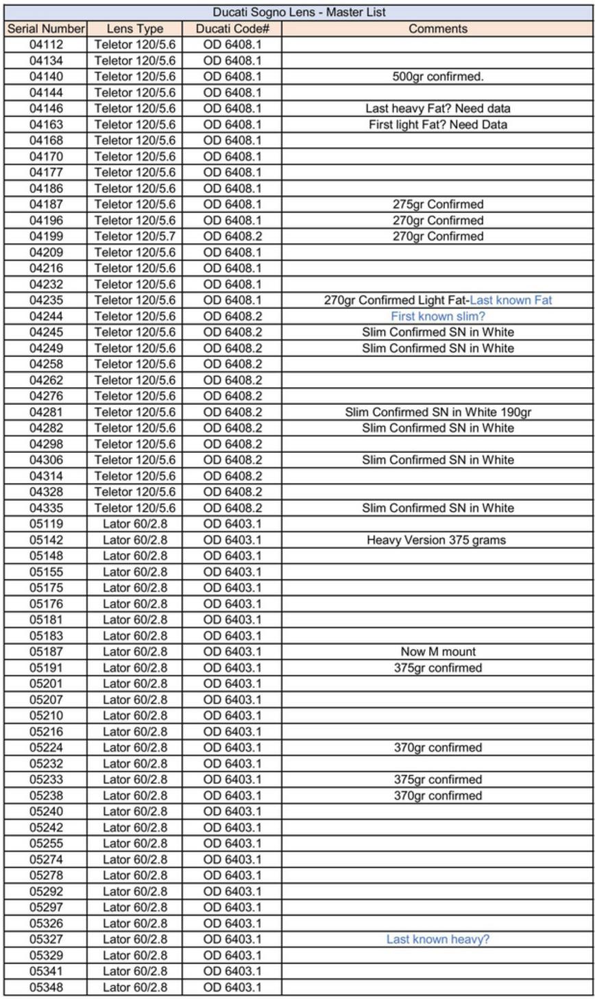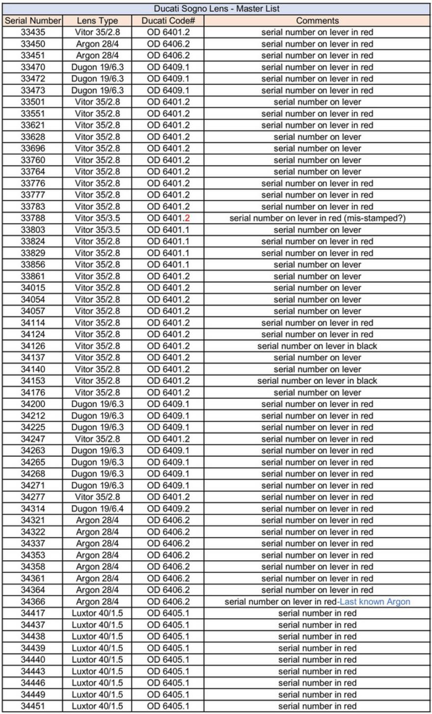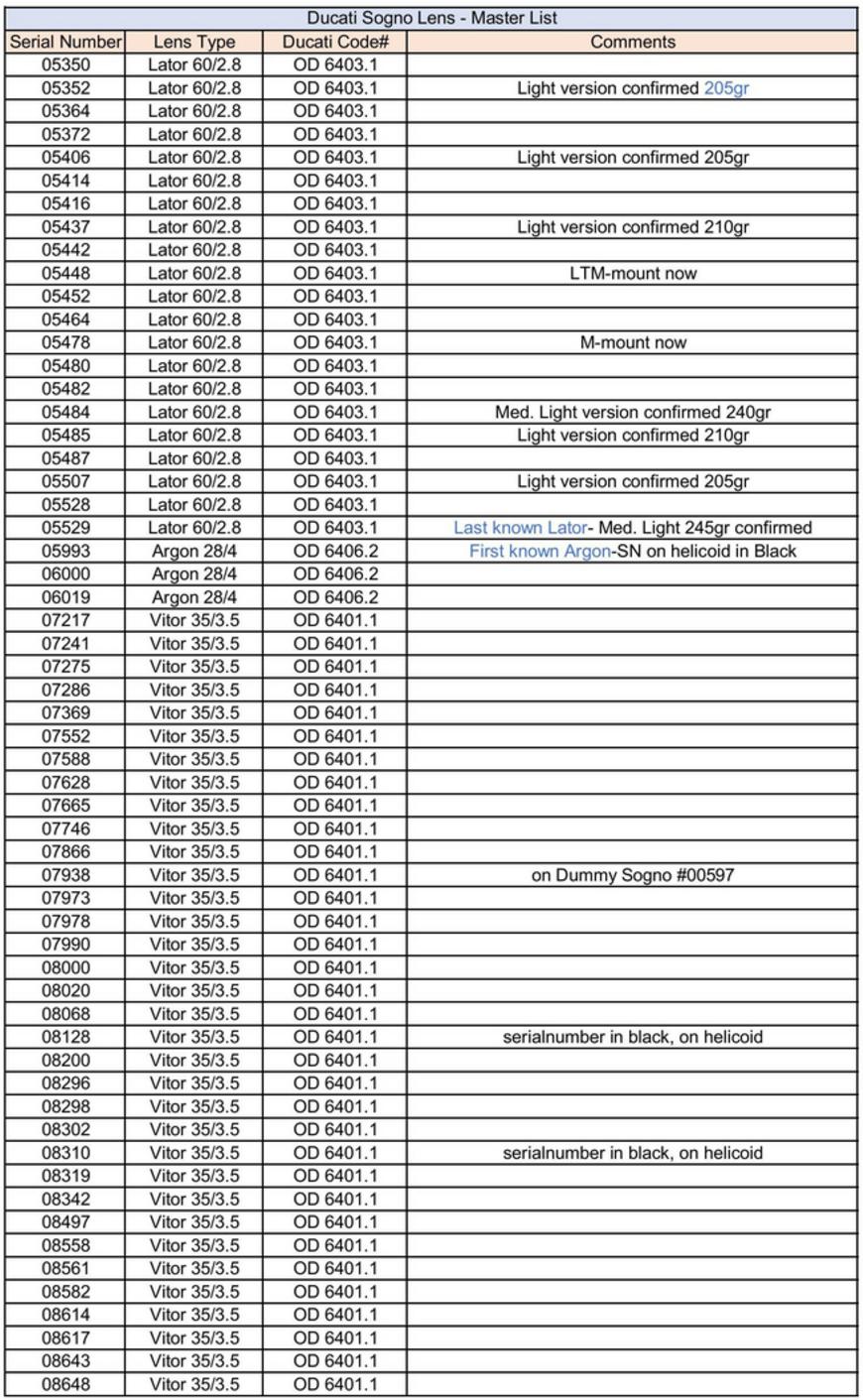 The Ducati Sogno Lens Serial Numbers have been a bit of a mystery, at least as far as the number produced, especially for the 4 rarest versions: The Luxtor, Eltor, Dugon and Argon. Please join us in our effort to identify as many as possible, especially these rarer versions. Just drop us a line with your lens serial numbers included, and any details as to the serial number location and color would be helpful, with weight included if possible. And please, don't be surprised if your lens is already listed here, we have searched eBay, Facebook, Worldwide Auctions, and any other sales or websites where photos of a lens could be found while compiling this list over the years.