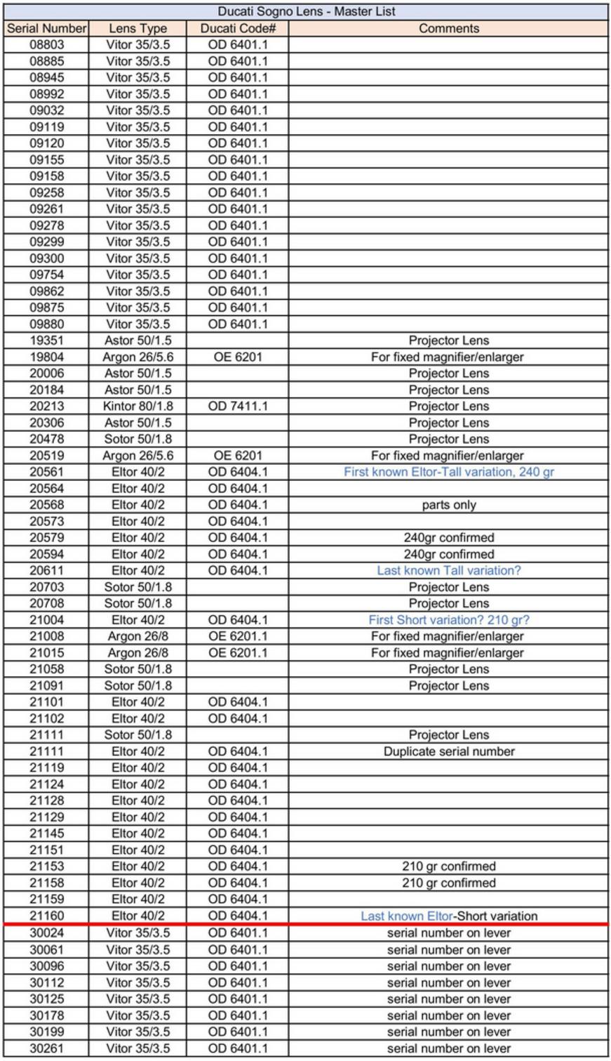 Our primary goal here in collecting these serial numbers is our ongoing effort to better establish the number of lenses produced by Ducati (the records are lost) in order for us collectors to better understand the rarity (and value) of our lenses. As a part of this we have also been able to identify more "Variations" than were previously known. Recently (2023) our friend Antonio Rossetto pointed out the 2 different versions of the Eltor, and we have identified the "Light" FAT version of the Teletor (2022) as well as the "Medium" Light version of the Lator (2023).