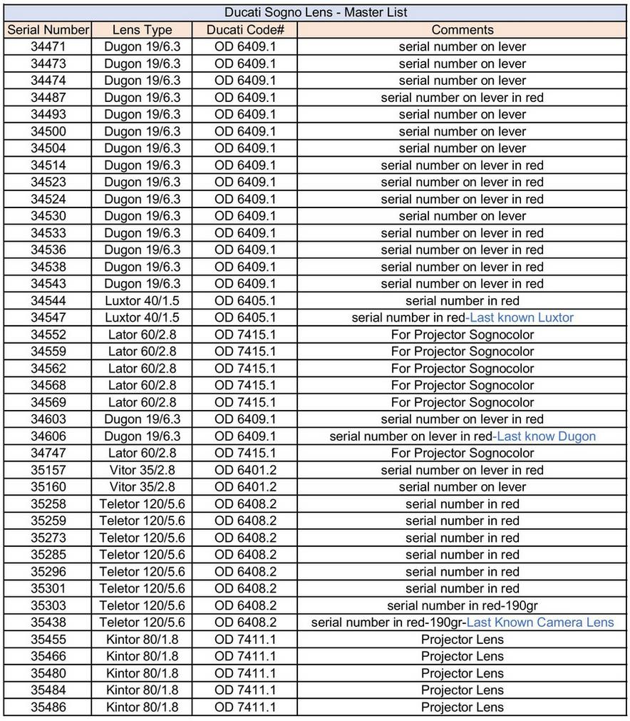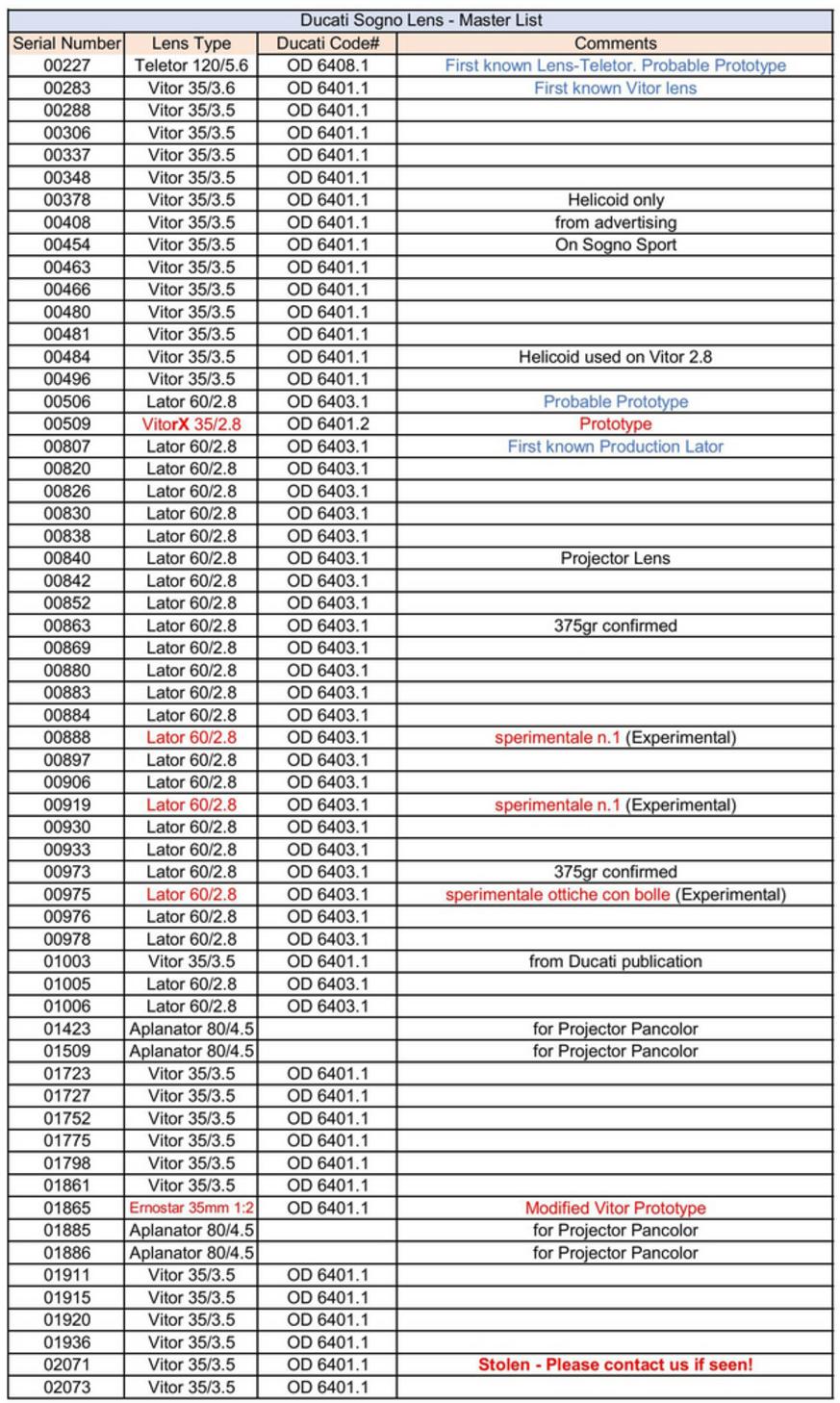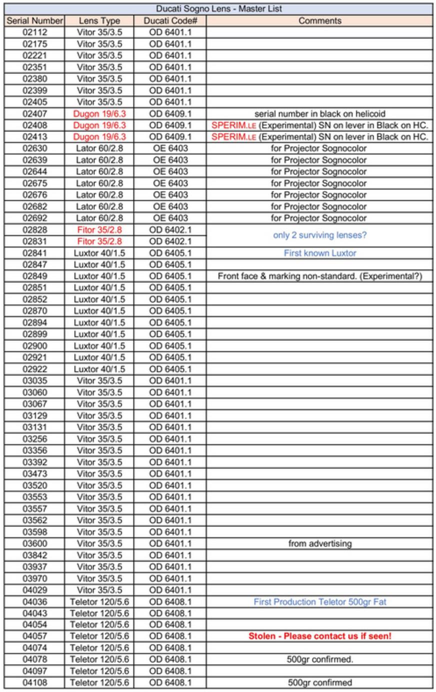 In preparation of the above pages, I must thank first Donato Consonni (Bencini Story) who began this list many years ago. I have been able to carry on expanding it with much research and the kind help of others, including especially: Manlio Malavolti (The Malavolti Collection), Gianni Medici (The Medici Collection), Yamane-san in Japan (who purchased the Ducati Family Collection), Watanabe-Ryuichi, Mario Casilli, Antonio Rossetto, Dario Mondonico and other kind collectors who have shared with us. If you have a collection, or even one interesting lens, please also share your database or lens numbers with us for the benefit the Ducati collecting community, thank you!