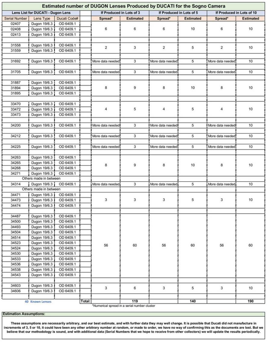 The following table is a list of known Dugon Lenses with the Serial Number and possible number produced in our estimate. Please help us in our efforts to expand this list by sending us any lens serial number/s not in our list so that it will be as accurate as possible, thank you! Latest UPDATE: Oct-25.