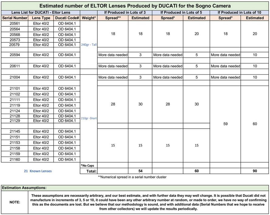 The following table is a list of known Eltor Lenses with the Serial Number and possible number produced in our estimate. Please help us in our efforts to expand this list by sending us any lens serial number/s not in our list so that it will be as accurate as possible, thank you! Latest UPDATE: Oct.-25.