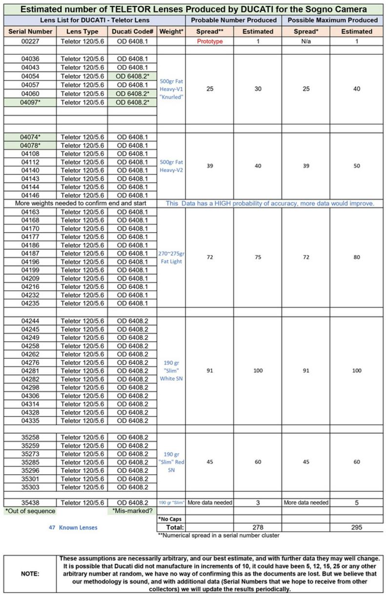 The following table is a list of known Teletor Lenses with the Serial Number and possible number produced in our estimate. Please help us in our efforts to expand this list by sending us any lens serial number/s not in our list so that it will be as accurate as possible, thank you! Latest UPDATE: Nov-25.
