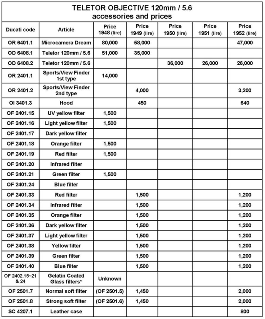 In the 1948 catalog the Teletor lens was present at the price of 51,000 lire, and there were also some accessories listed (hood and filters) as well as the sport/view finder of the first type (OR 2401.1) suitable for use with both the Lator and Teletor lenses.