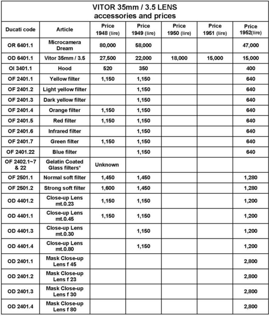 Various accessories were manufactured which we have described in a table below. The price of this lens over time decreased from 27,500 lire in 1948 to 15,000 lire in 1952.